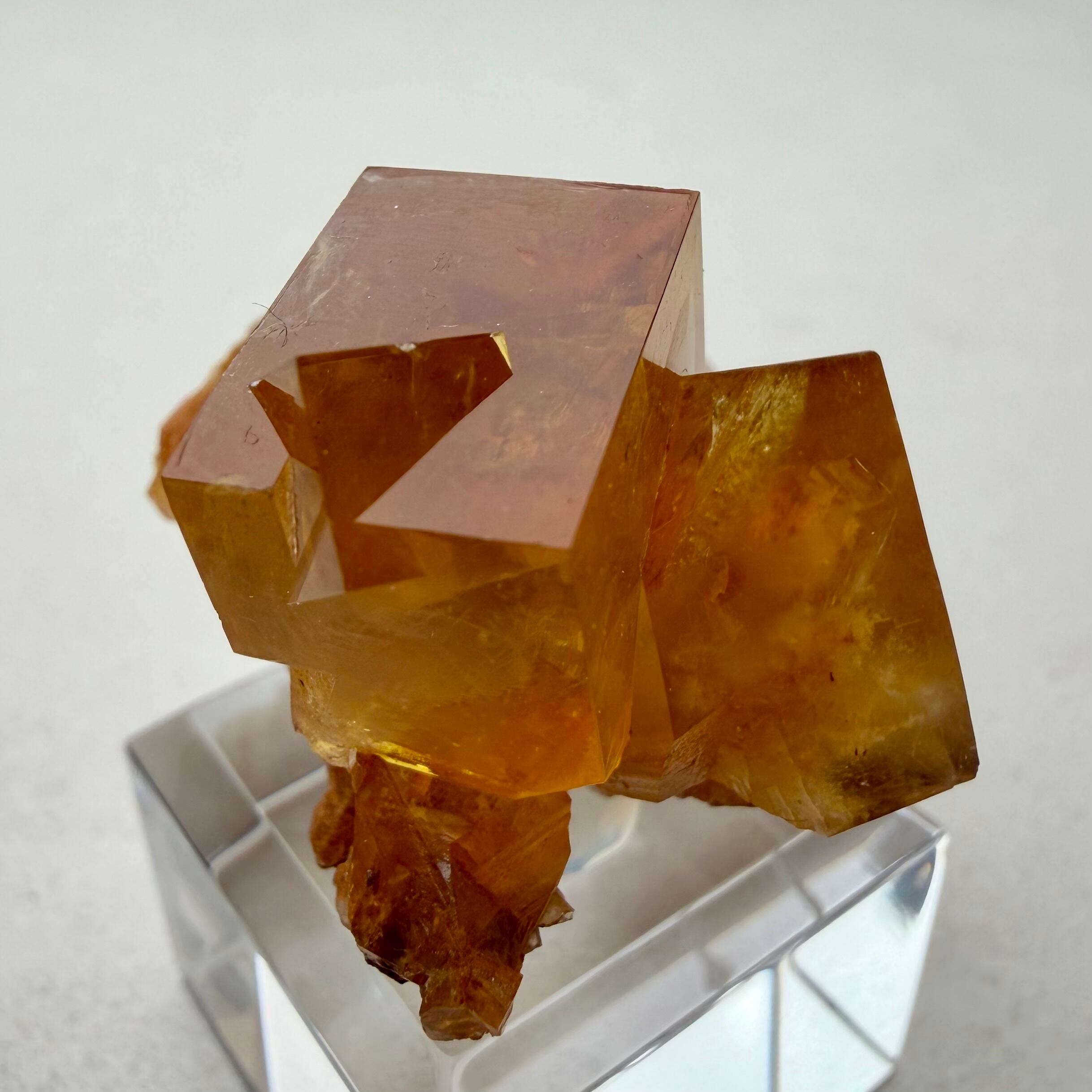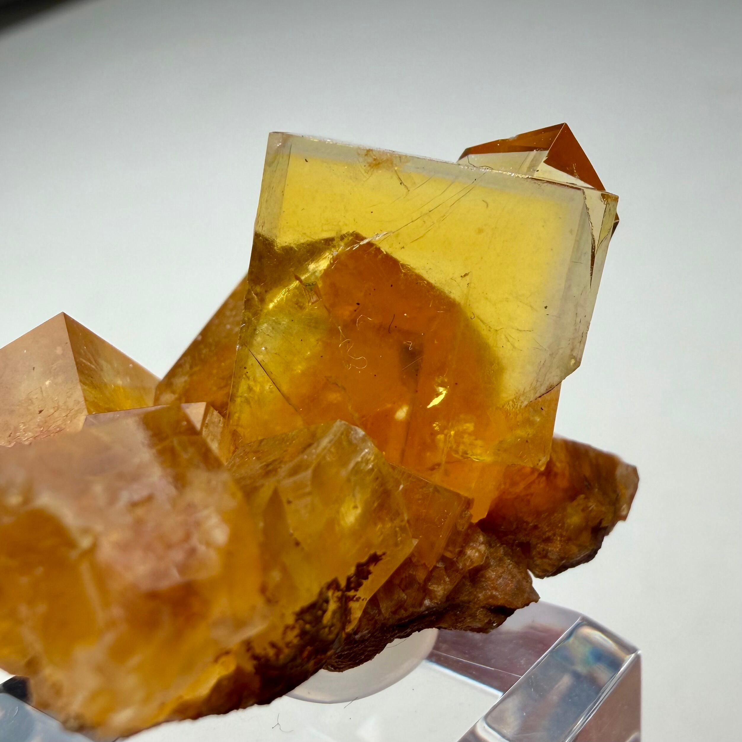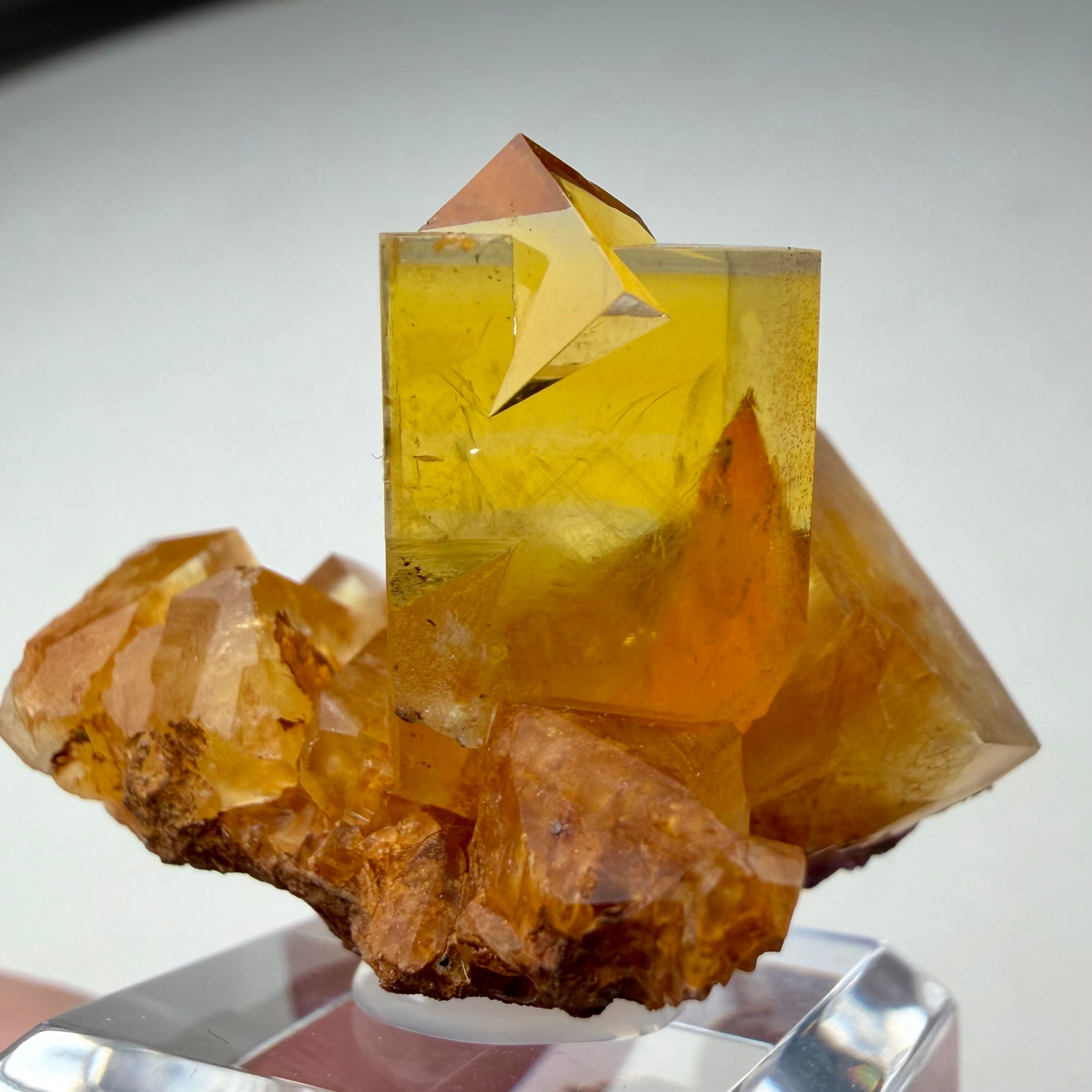 それに加えてメイン結晶は貫入双晶、全体的に強いテリと透明感があり、オレンジの発色以外も非常に魅力的な標本です。