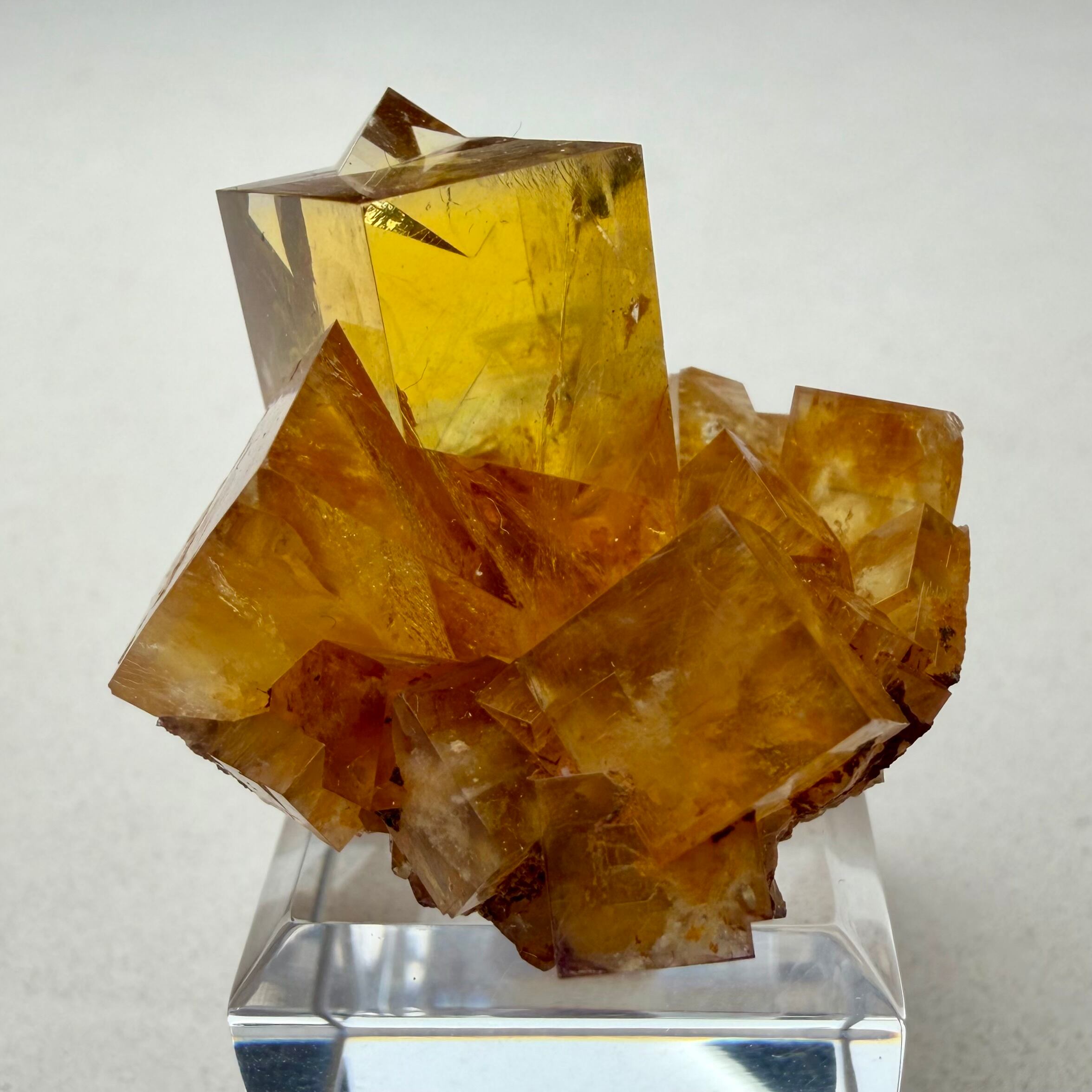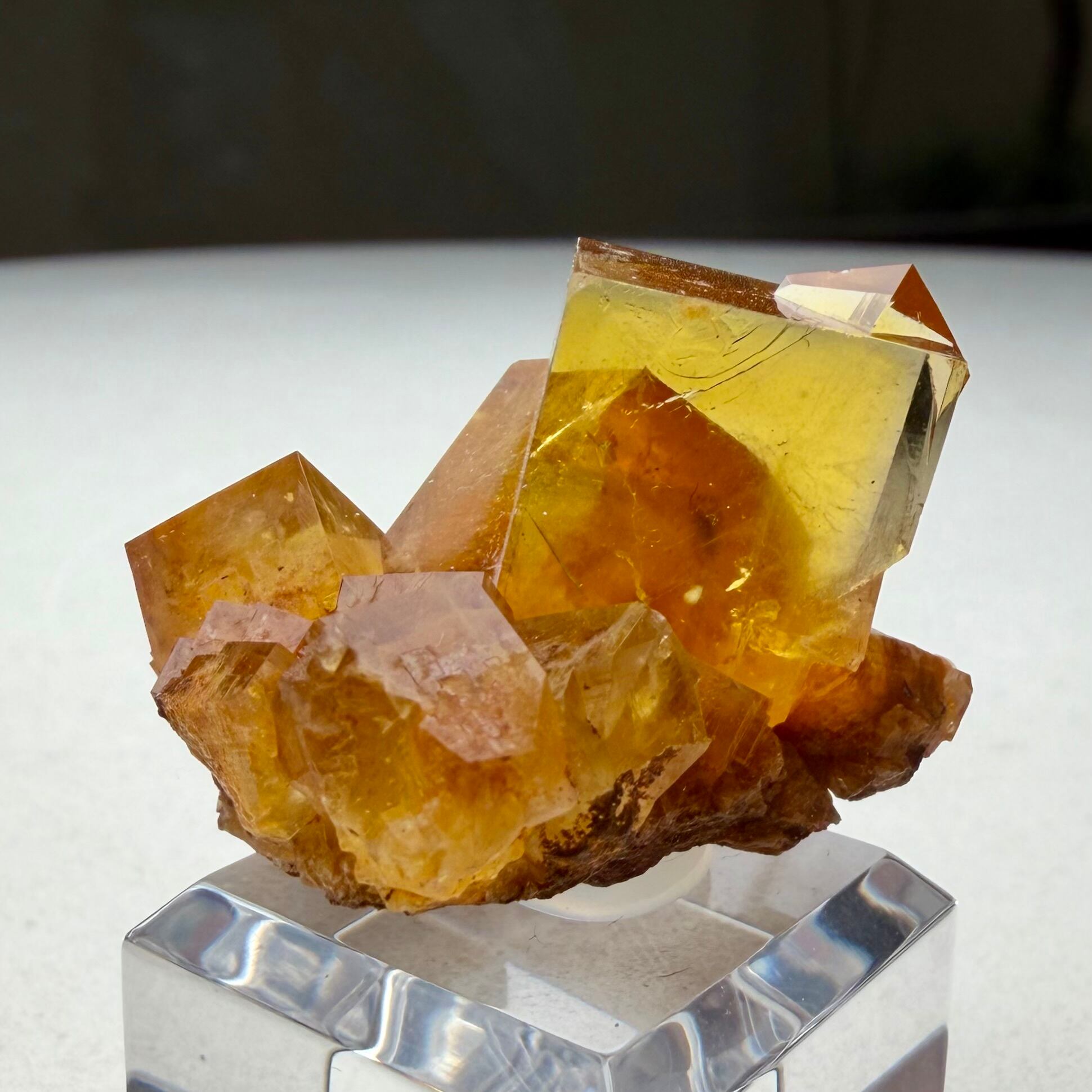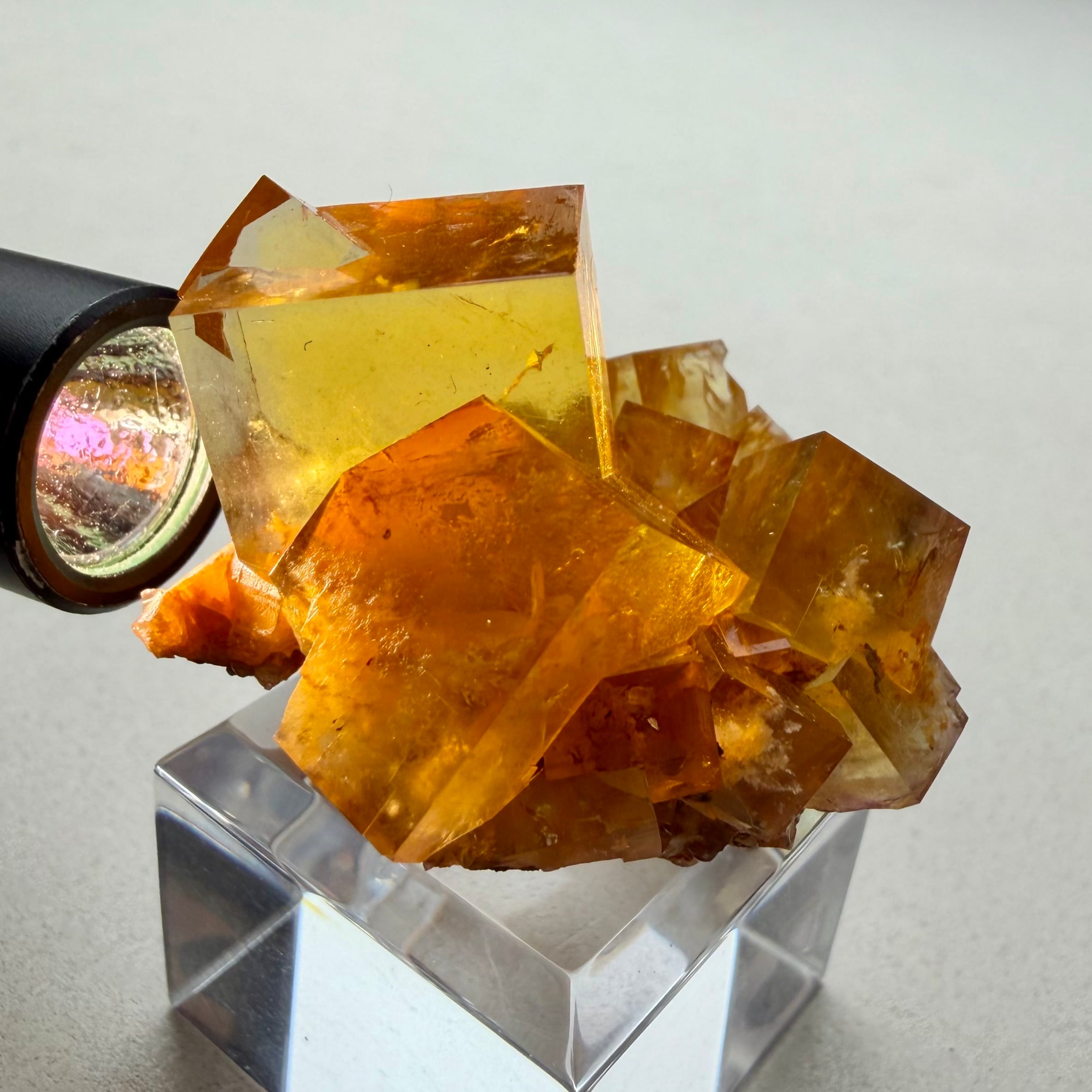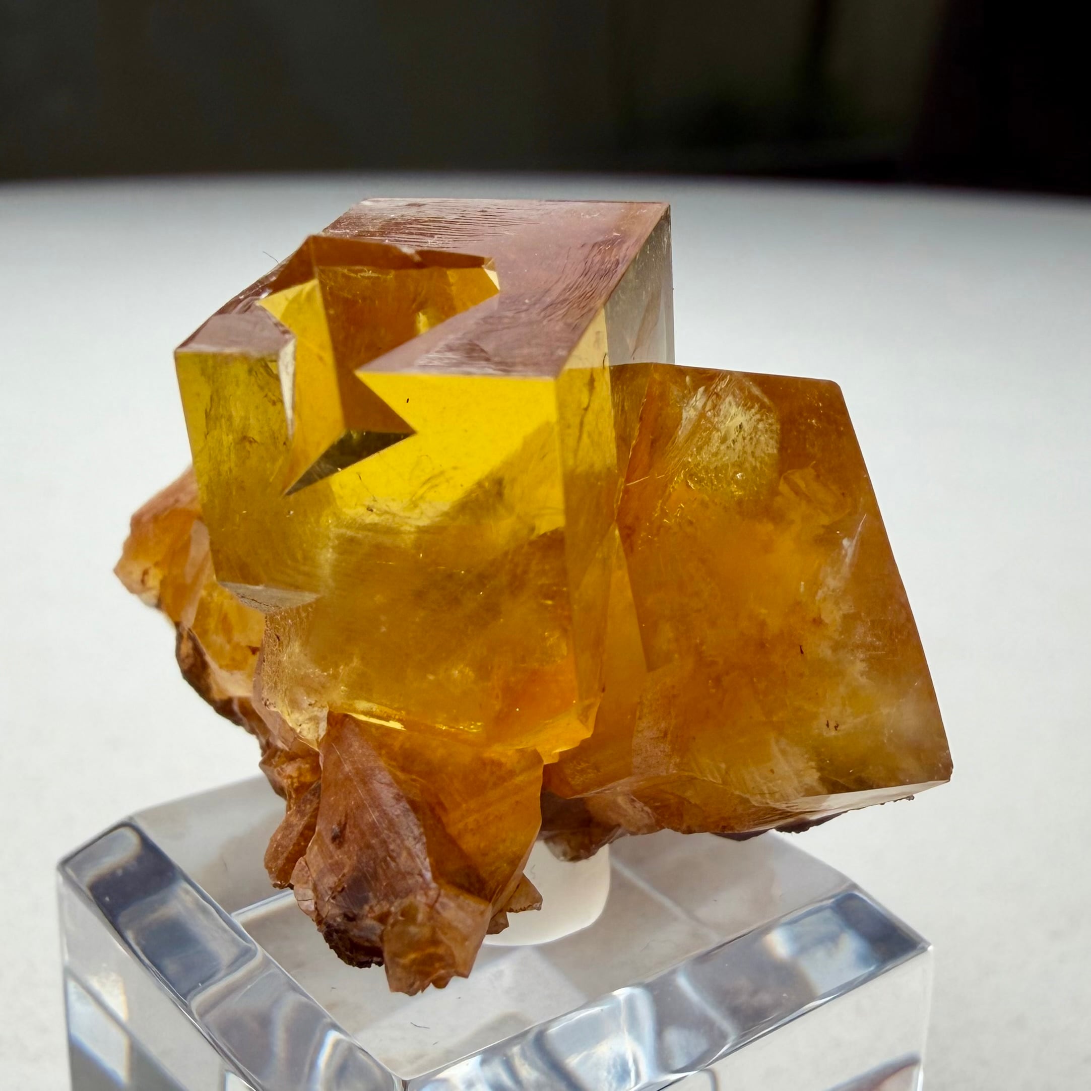 それに加えてメイン結晶は貫入双晶、全体的に強いテリと透明感があり、オレンジの発色以外も非常に魅力的な標本です。