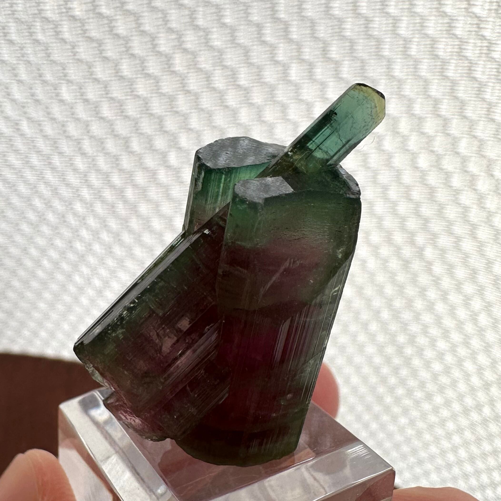 メインの太い結晶はダメージはあれど透明感やテリがあってトップも良好、もう片側は先細りの結晶が非常にクリアで美しい、ユニークさと美しさを兼ね備えた標本です。