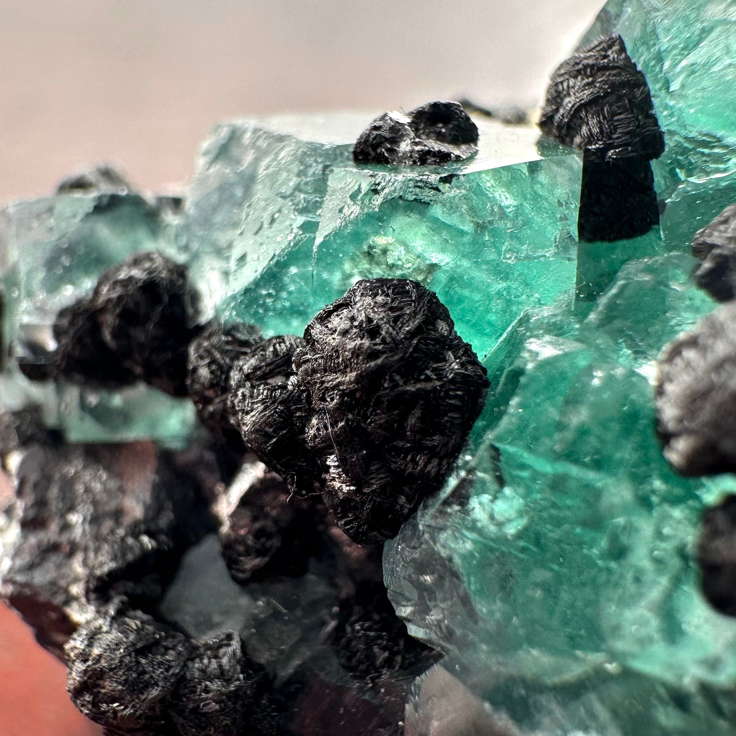 濃いグリーンながらネオン感の潜むユニークな色合いが魅力的な結晶、その一部にはパイライトを内包する非常にユニークな標本で、パイライトは内包するものもですが小さな粒状のものが全体的に見られます。