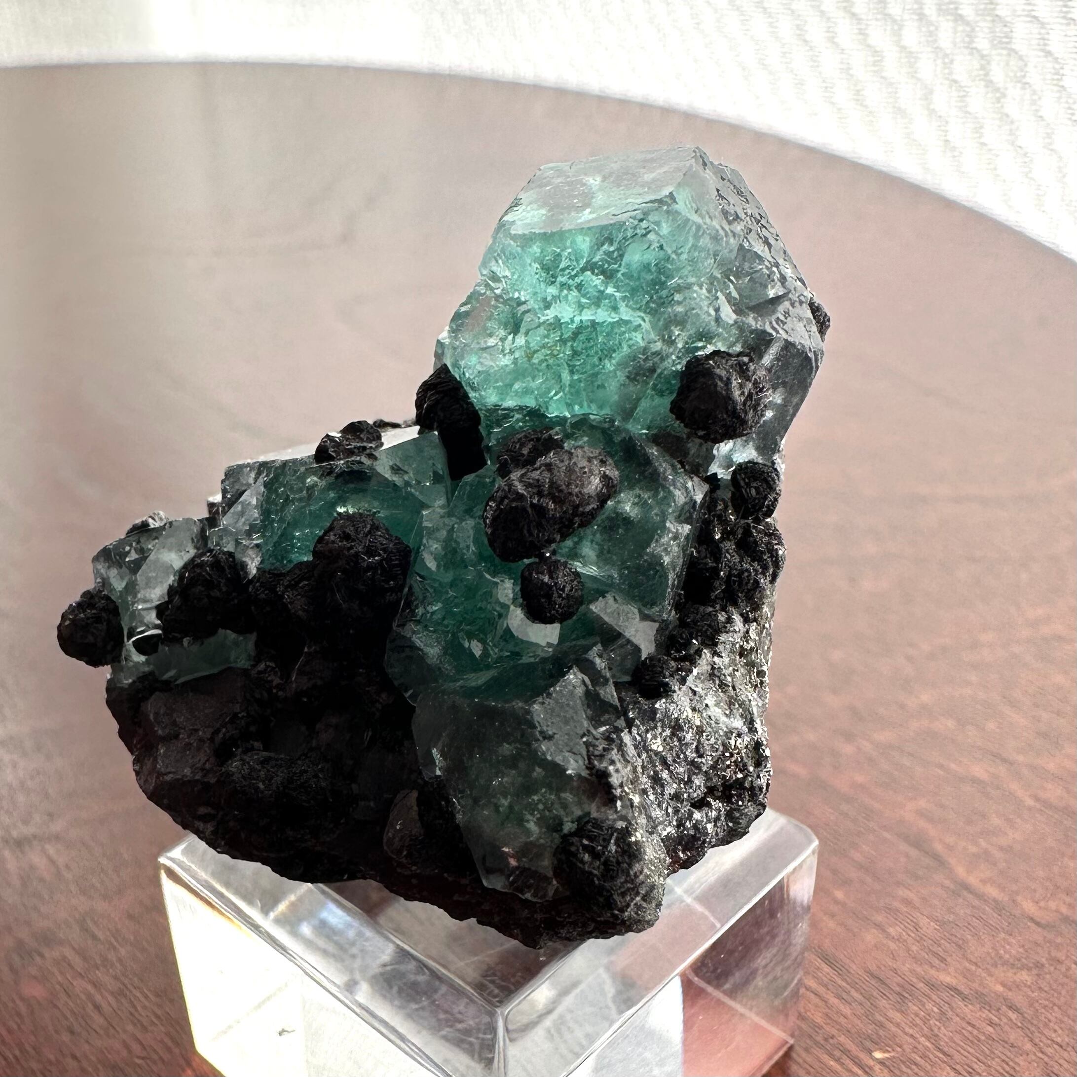 ペルーのグリーンフローライトに幾つかの鉱物が共生した盛りだくさんの標本です。