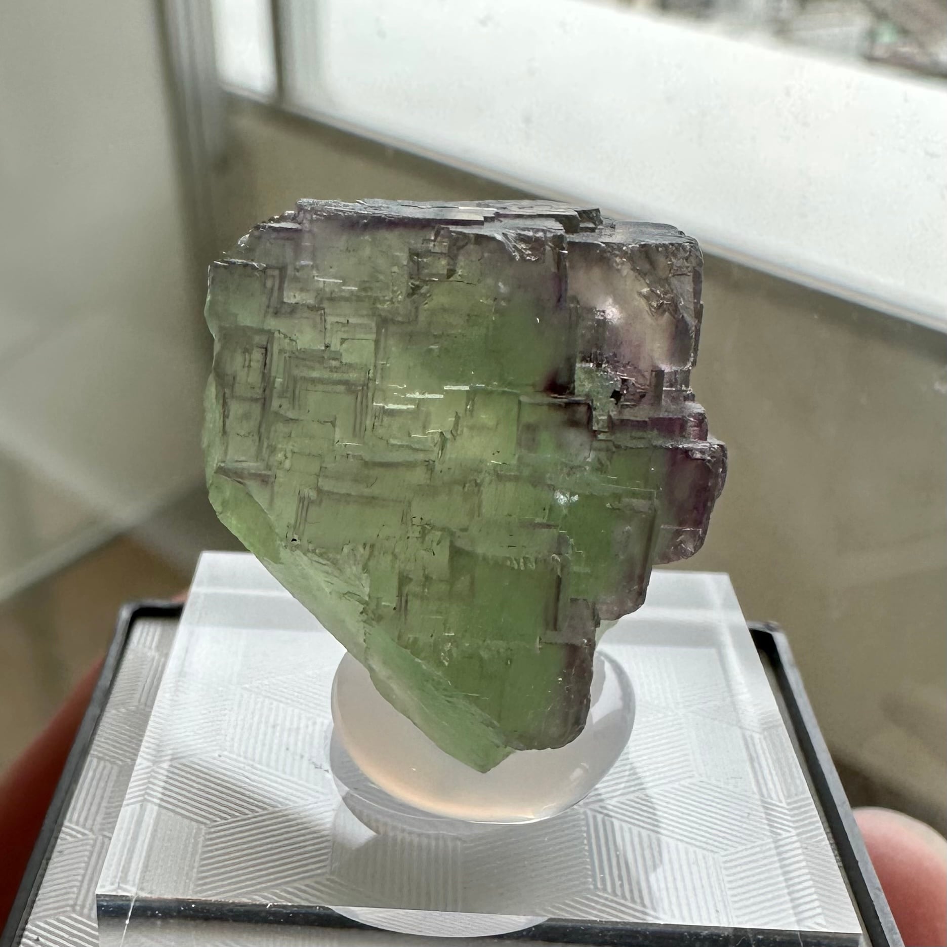 この結晶では残念ながらブルーが見られずレインボーフローライトといった景色ではありませんが、透過光下ではグリーンやパープルと言った発色がはっきりと確認できます。
