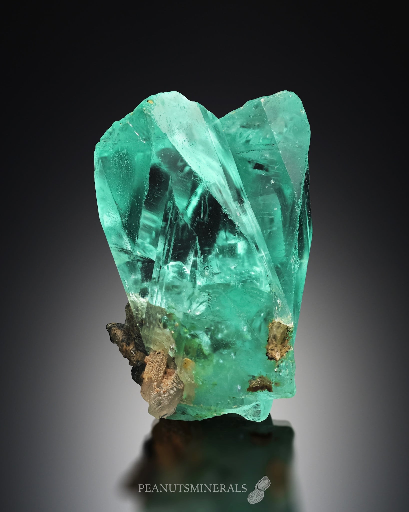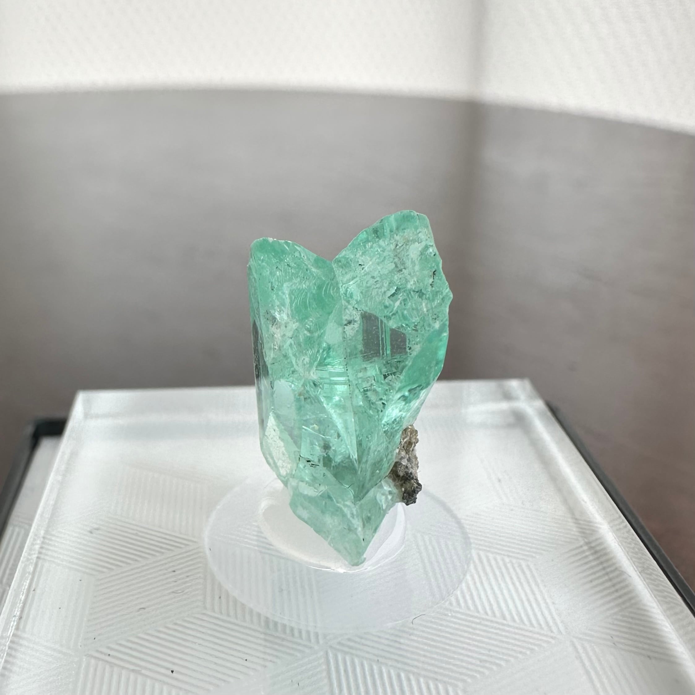 発色が良くクリアでテリの強さが際立つ結晶で、結晶後方にダメージがありますが、このクオリティで綺麗な双晶が見られるものも少ないかと思います。