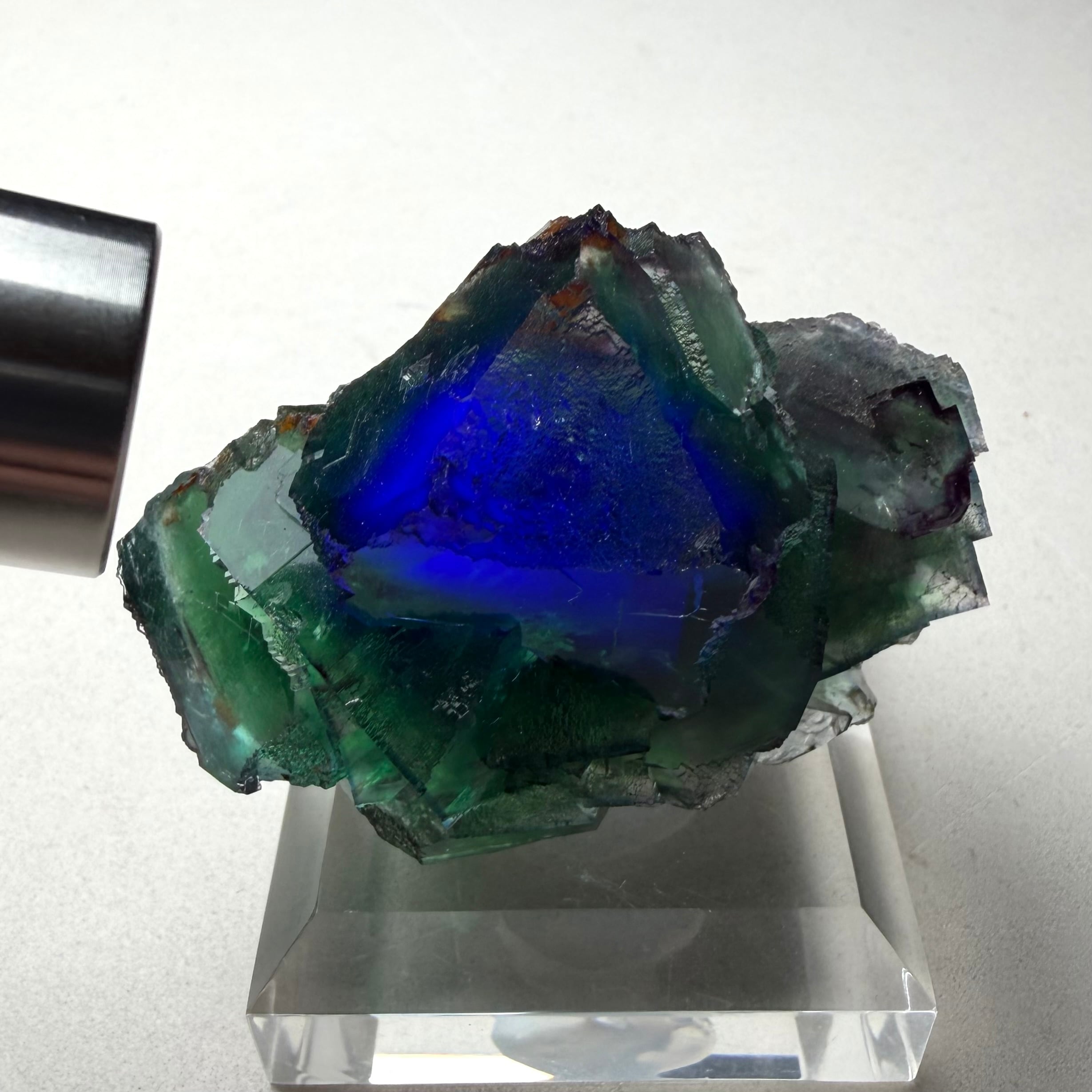 この産地のものとしては珍しくガラス光沢に近しい光沢を持ち、厚みのある結晶ながら透明感も良好で、美しいブルーやその他の発色が確認出来る良結晶です。