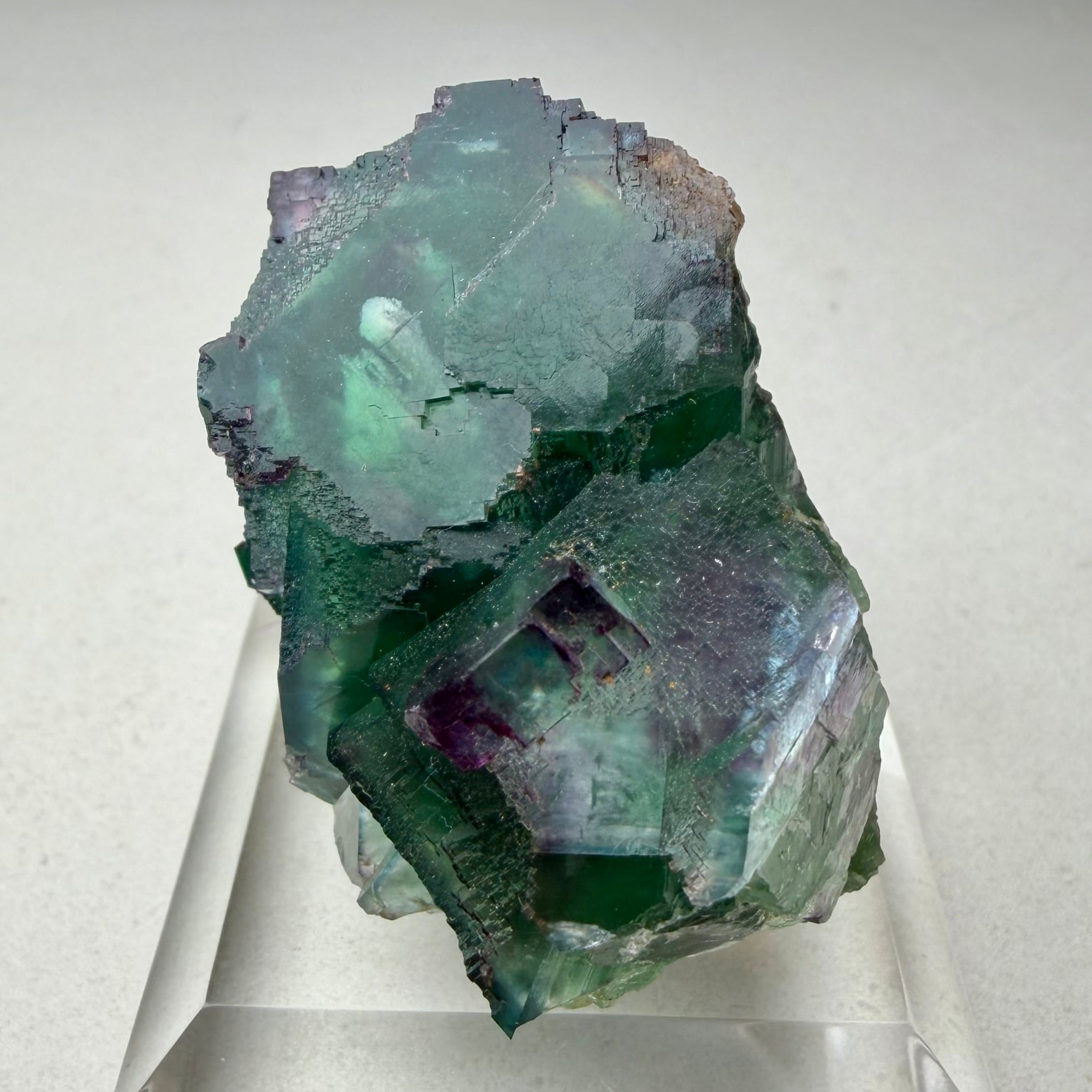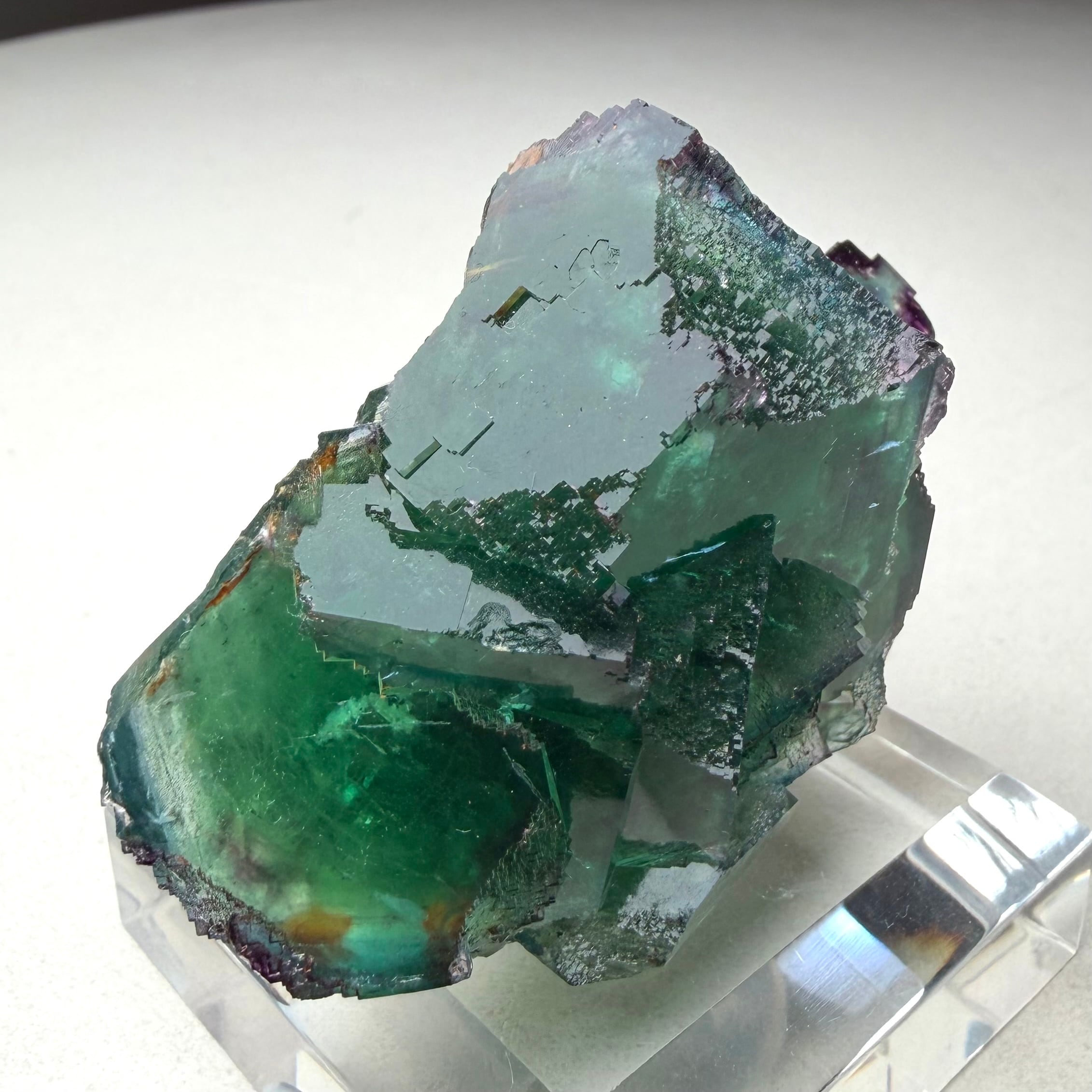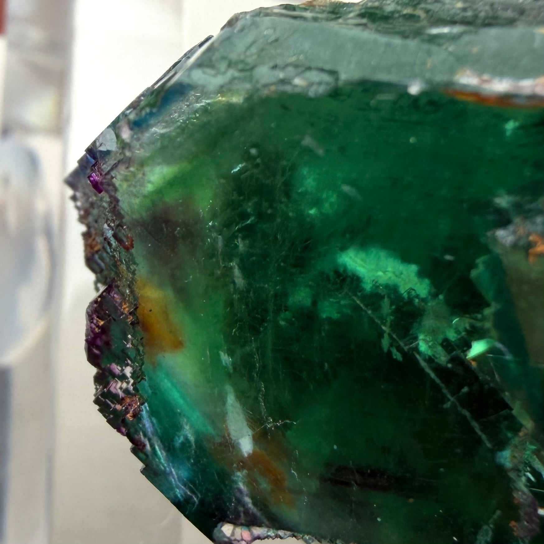 この産地のものとしては比較的珍しく強いガラス光沢を持ち、厚みのある結晶ながら透明感も良好で、グリーンのみならずブルーやパープルの発色も確認出来る良結晶です。