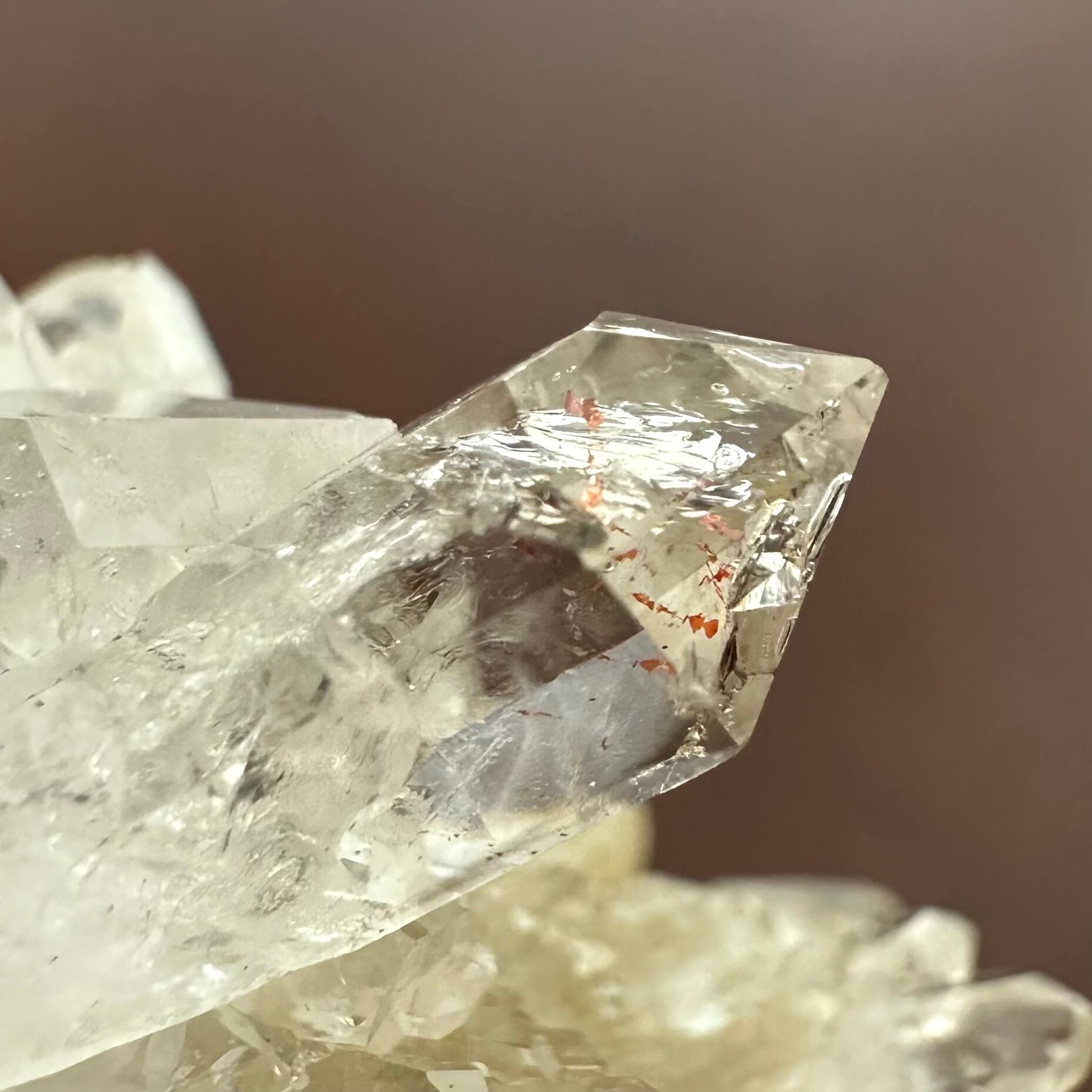 全体的にとはいきませんが僅かにヘマタイトを内包し、仄かにスモーキーがかった部分もある見所の多い標本です。