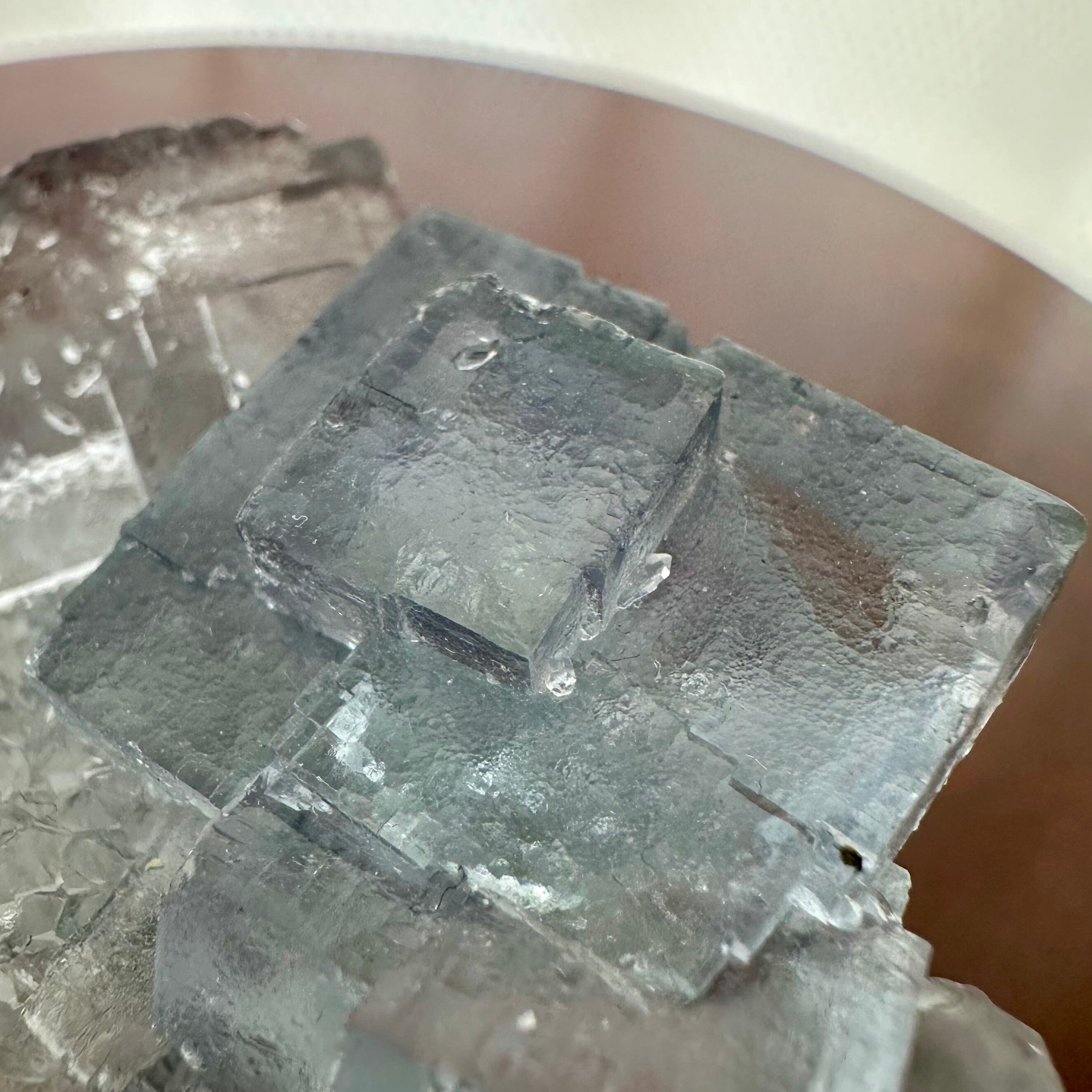 表面が磨りガラス状の結晶で厚みもありますが透明感が良好で、ブルーのゾーニングやユニークな凹凸が見られます。